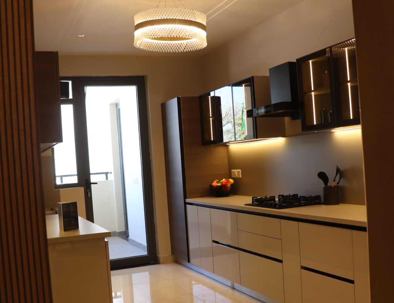 A sleek, high-end modular kitchen designed for style, convenience, and functionality.